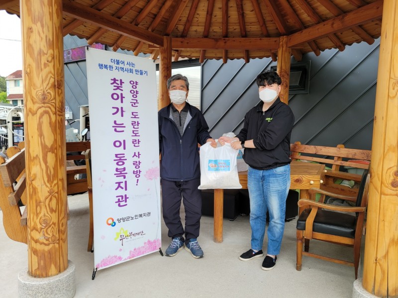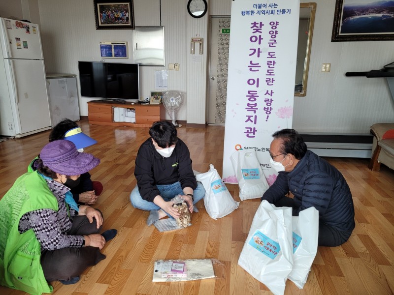 코로나19로 인해 찾아가는 이동복지관 프로그램을 못하게된 강현면, 손양면, 현북면, 현남면 경로당 45개소 225개를 혼자서도 할 수 있는 물품(에코백만들기, 표고버섯키우기)로 구성하여 전달하였습니다. 농번기라 바쁘신 와중에도 프로그램을 잘 참여해 주셨습니다. 또한 경로당 이용자 어르신들이 직접 키우신 표고버섯을 사회복지사가 일부 수확하여 복지관내 경로식당 도시락에 반찬으로 제공한다고 말씀드리니 흔쾌히 어르신들께서 좋은 일에 사용하는 거니 마음껏 가져가라고 행복한 나눔 활동하게 해줘 너무 고맙다고 하셨습니다. 어르신들이 키우고 나눠준 버섯을 경로식당 도시락 대상자 37명에게 버섯을 조리하여 전달해 드렸습니다.